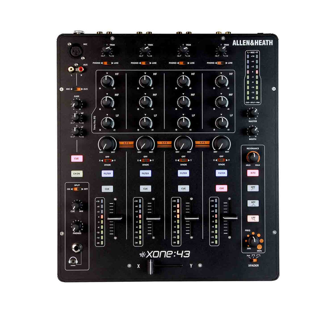 The Allen & Heath XONE:43 is a 4 Channel Analogue DJ Mixer. Created for DJs and electronic music purists, Xone:43 is a 4+1 channel DJ mixer that offers the very best of analogue audio quality, including the legendary Xone filter with resonance control, 3 band EQ, crossfader with three curve settings and X:FX for send/return to your favourite FX unit. The crossfader has three switchable curve settings for blending or scratching styles and can be easily replaced or upgraded to a custom Innofader for ultimate crossfader performance. With balanced XLR main outputs, independent booth and record outputs, Xone:43 excels in the club and in high end personal DJ setups.